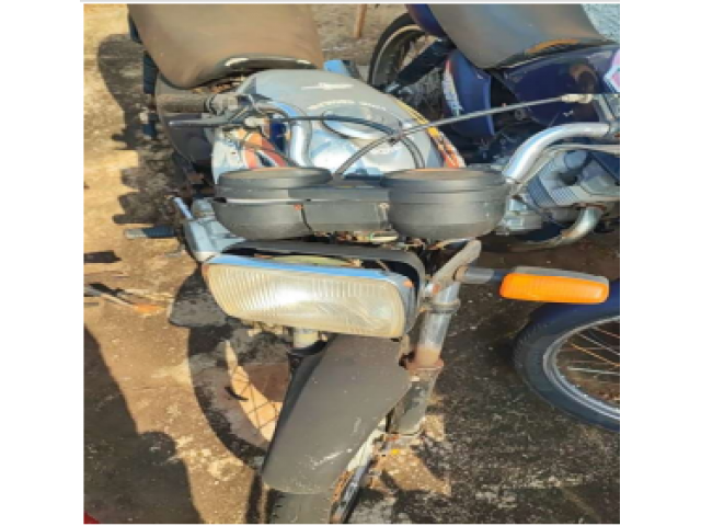 HONDA/CBX 150 AERO, placa A**-**97/PR, 1988/1988, cor cinza. Trata-se de uma motocicleta em estado de sucata aproveitável. Sua pintura está manchada, desbotada, descascada, com riscos e marcas de ferrugem. Além disso, suas carenagens estão avariadas, assim como, para-lamas, farol, painel, tanque de combustível, banco e outros itens. Entre os itens faltantes, constatou-se: retrovisores, carenagens traseira, lanterna, setas traseira, jogo de ferramentas e chaves de ignição. Por fim, algumas peças não são originais do modelo em questão. (Proc. 0002313-52.2023.8.16.0180)
