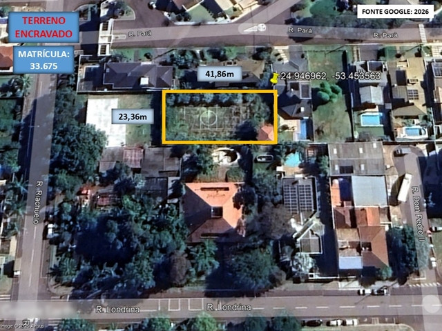 OBS.1: Conforme avaliação o imóvel não presenta testada ou saídapara logradouro, está encravado no interior da quadra. Benfeitorias não averbadas namatrícula, uma quadra poliesportiva à base de cimento alisado, em estado de abandona e semmanutenção. Com estrutura tipo vestiário com cerca 50m², quatro postes que serviam deiluminação. O imóvel avaliado localiza-se aos fundos da edificação com entrada pela Rua Londrina, nº 2312, o local também está abandonado e com correntes e cadeados nos portões.Como já foi dito, o terreno está encravado no interior da quadra e é confinantes aos imoveis3, 4, 30D, 31, 32 e aos fundos com Country Ville Condomínio.
