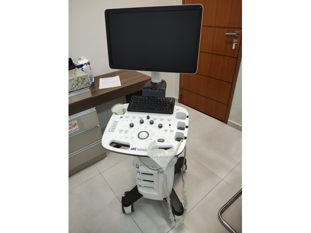 Equipamento de diagnóstico por ultrassom, da marca SAMSUNG, modelo HS30, número de série S1JBM3HM300004A (potência: 100-240V/620VA/50/60Hz), cor branca com detalhes na cor preta, base contendo rodízios, composto por monitor de vídeo, teclado, painel de controle, sonda, em bom estado de uso, conservação e funcionamento. (Proc. 0010621-70.2025.5.03.0099)