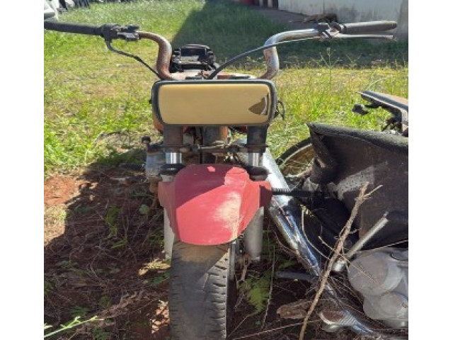 Obs.: Trata-se de uma motocicleta em estado de sucata inservível, haja vista seu atual estado de conservação e registro de baixa perante o órgão competente. Sua pintura está manchada, desbotada, descascada, com riscos e diversos pontos de ferrugem. Além disso, seus para-lamas apresentam avarias, assim como, tanque de combustível, farol, lanterna traseira, motor e outros itens. Quanto aos pneus, apresentam-se sem condições de uso. Por fim, entre os itens faltantes, constatou-se: carenagens, banco, painel de instrumentos, piscas, retrovisores, jogo de ferramentas e chaves de ignição.