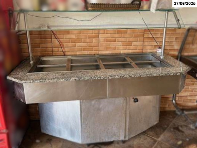 Buffet térmico para self service com 08 (oito) cubas quentes, granito na parte superior, inox e vidro nas demais, 220V, em bom estado de conservação e em funcionamento. (Proc. 0010199-18.2024.5.18.0001)