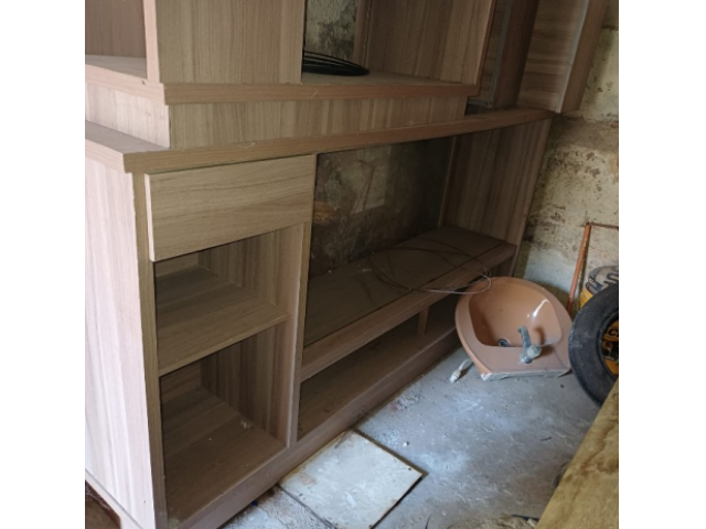Lote c/ Balcão em MDF, amadeirado, tipo expositor, com tampo e frente em vidro, uma prateleira e uma gaveta, medindo aproximadamente 2,05 m de comprimento, 0,50 m de largura e 1,00 m de altura. Produto usado, em regular estado de conservação.; Balcão em MDF, amadeirado, tipo expositor, com tampo em vidro,duas prateleiras, medindo aproximadamente 1,10 m de comprimento, 0,50m de largura e 1,00 m de altura. Produto usado, em regular estado de conservação.; Mostruário “Tipo Escada” em MDF, amadeirado, com três degraus, medindo aproximadamente 0,80 m de comprimento, 0,60 m de largura e 0,60 m de altura. Produto usado, em regular estado de conservação. (Proc. 0010997-73.2020.5.03.0053)